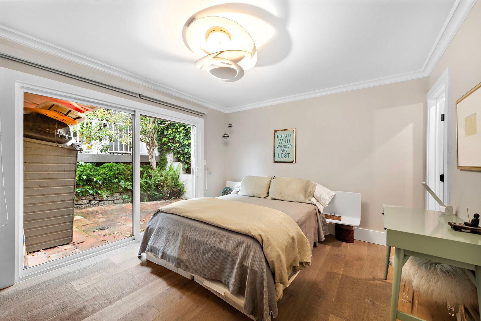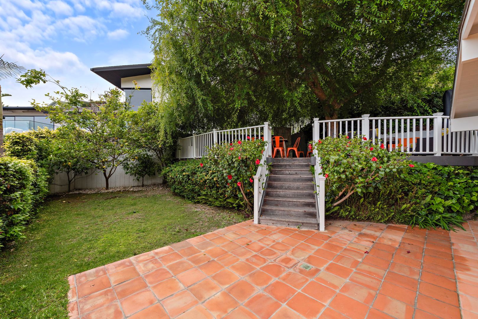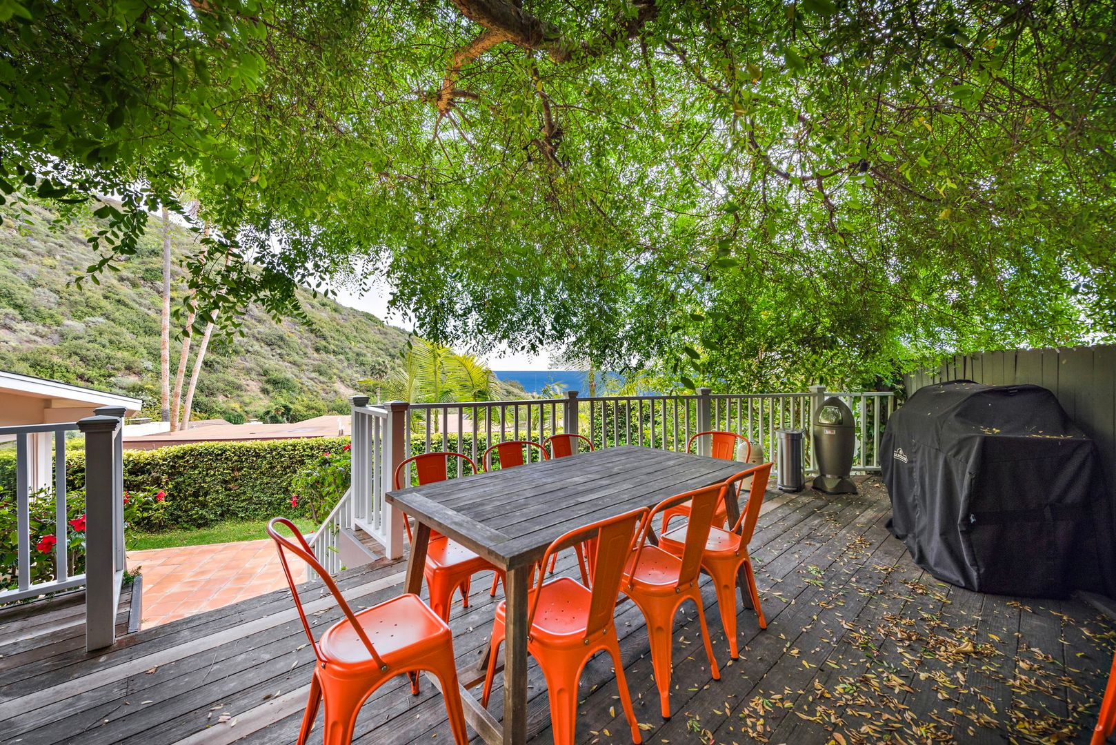 The backyard “treehouse” deck is an entertainer’s dream, nestled under a mature Chinese elm and offering both ocean and mountain views. The space includes a fire pit table, lounge seating, a dining table with seating for 12, a gourmet grill, and a professional-grade paella burner with pans.