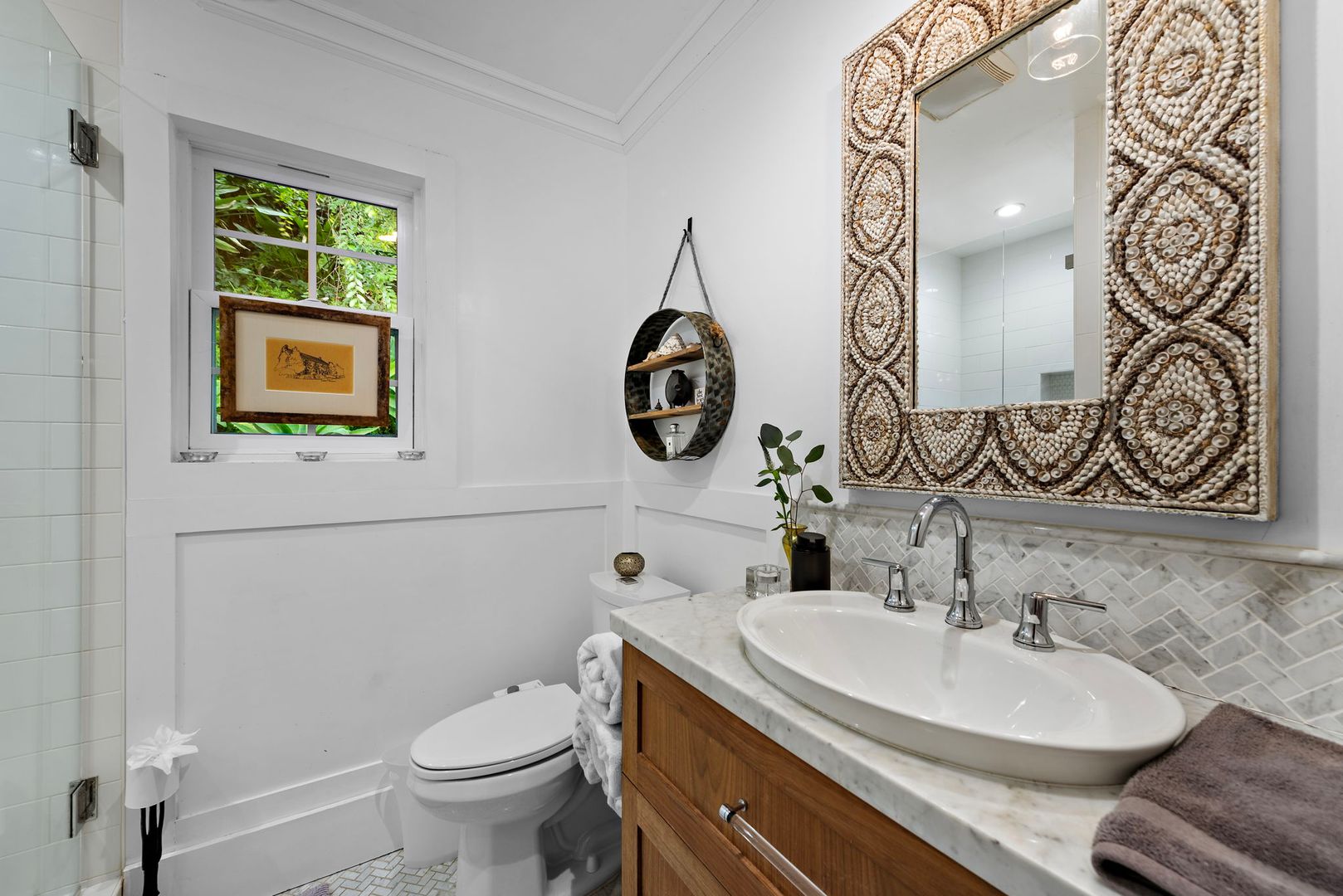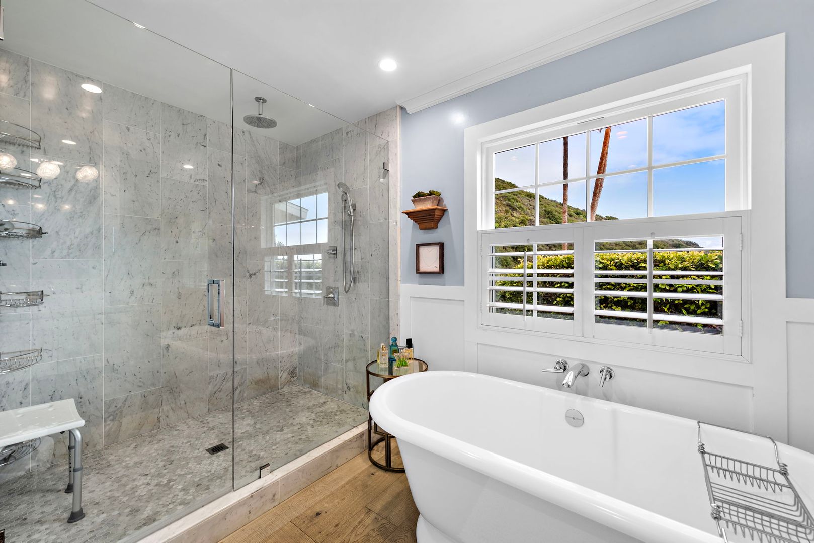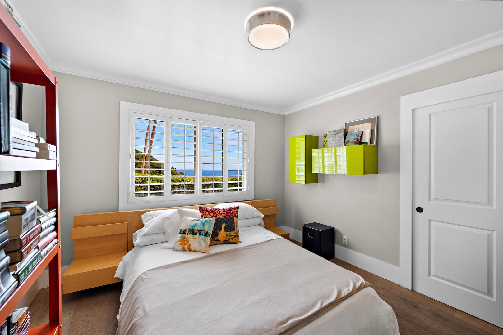 The serene primary suite is light-filled and airy, with vaulted ceilings, ocean views, and direct access to a large backyard featuring an elevated ocean-view deck. The en-suite bathroom is luxuriously appointed with dual vanities, a soaking tub, and a spacious walk-in shower. Two additional bedrooms and full baths offer comfortable accommodations for guests or family.