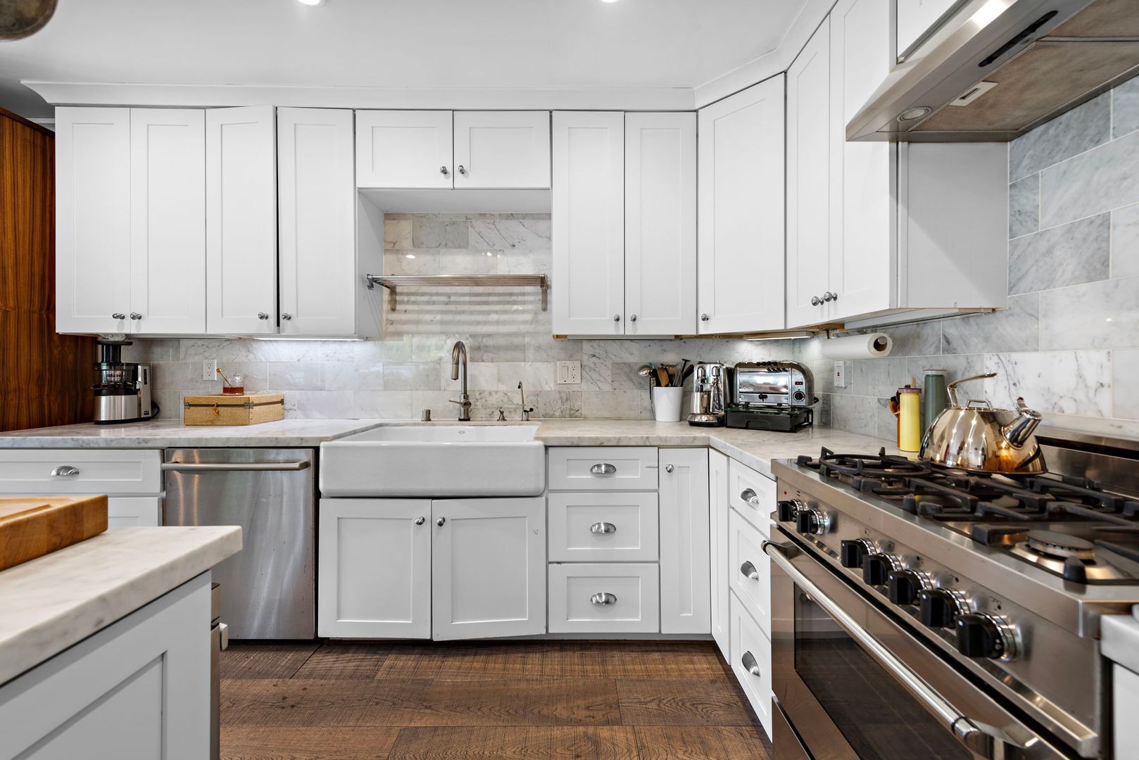 The chef’s kitchen is a showstopper, featuring state-of-the-art appliances from Viking, Bertazzoni, and Bosch, stunning white marble countertops with full-height backsplash, a center island with bar seating, and a beverage refrigerator—perfect for casual meals or elegant entertaining.