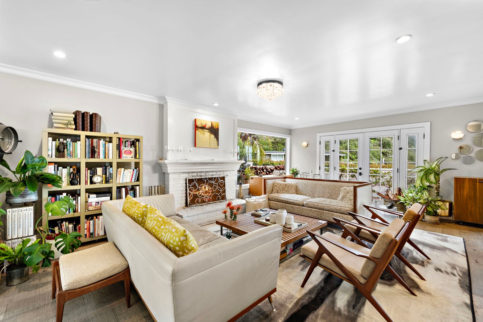 This single-level residence features an open-concept layout ideal for entertaining, with the living, kitchen, and dining areas flowing seamlessly together. The spacious living room includes a romantic wood-burning fireplace with a classic wood mantel, French doors leading to the front and side yards, and French Oak hardwood floors throughout.